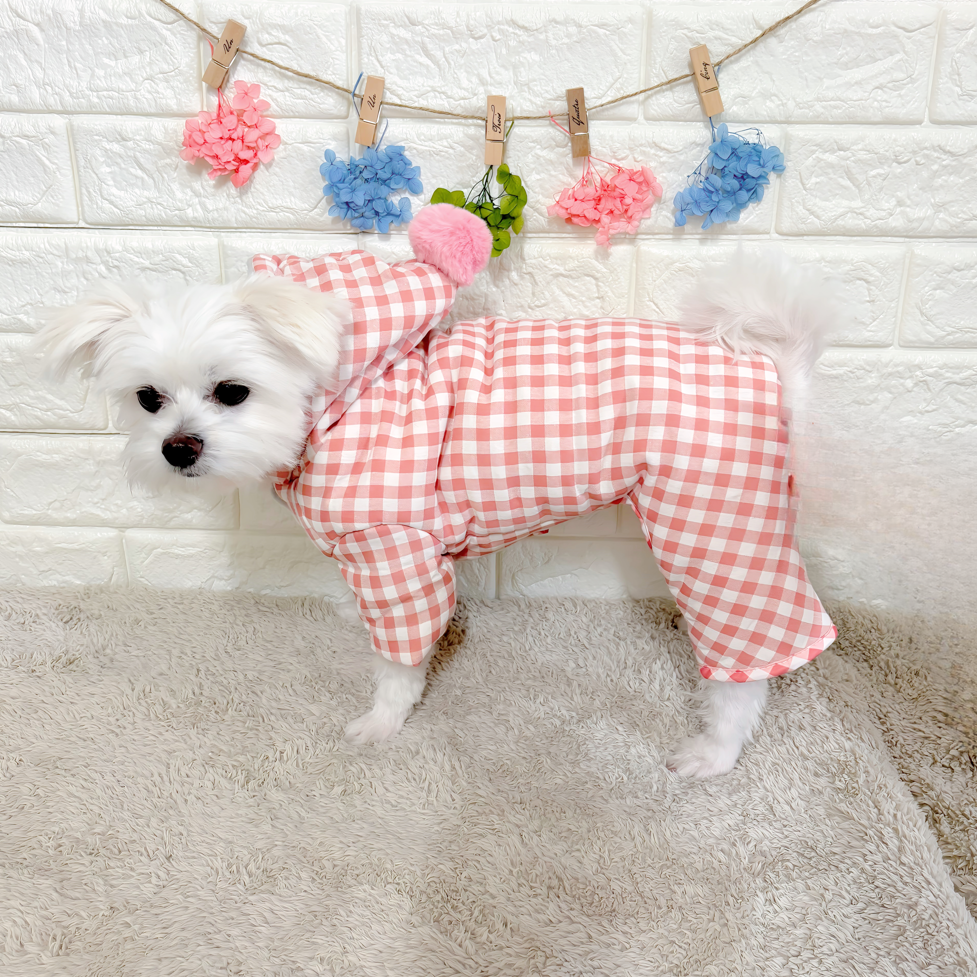 ポンポン付きギンガムチェックドッグウェア!おしゃれで可愛いギンガムチェック柄とふわふわポンポンが魅力の犬用洋服。内側ふわふわ素材で暖かく、秋冬のお散歩やお出かけにぴったりな小型犬向けドッグウェアです!